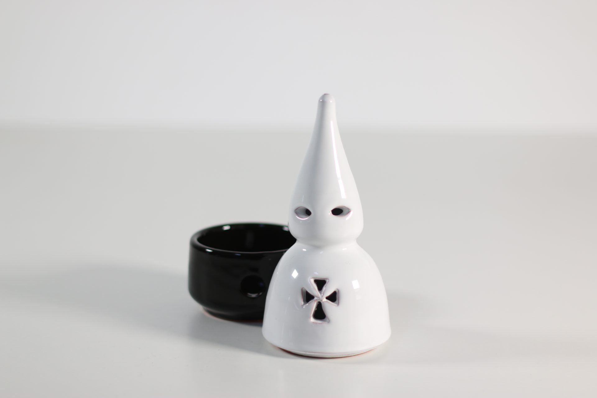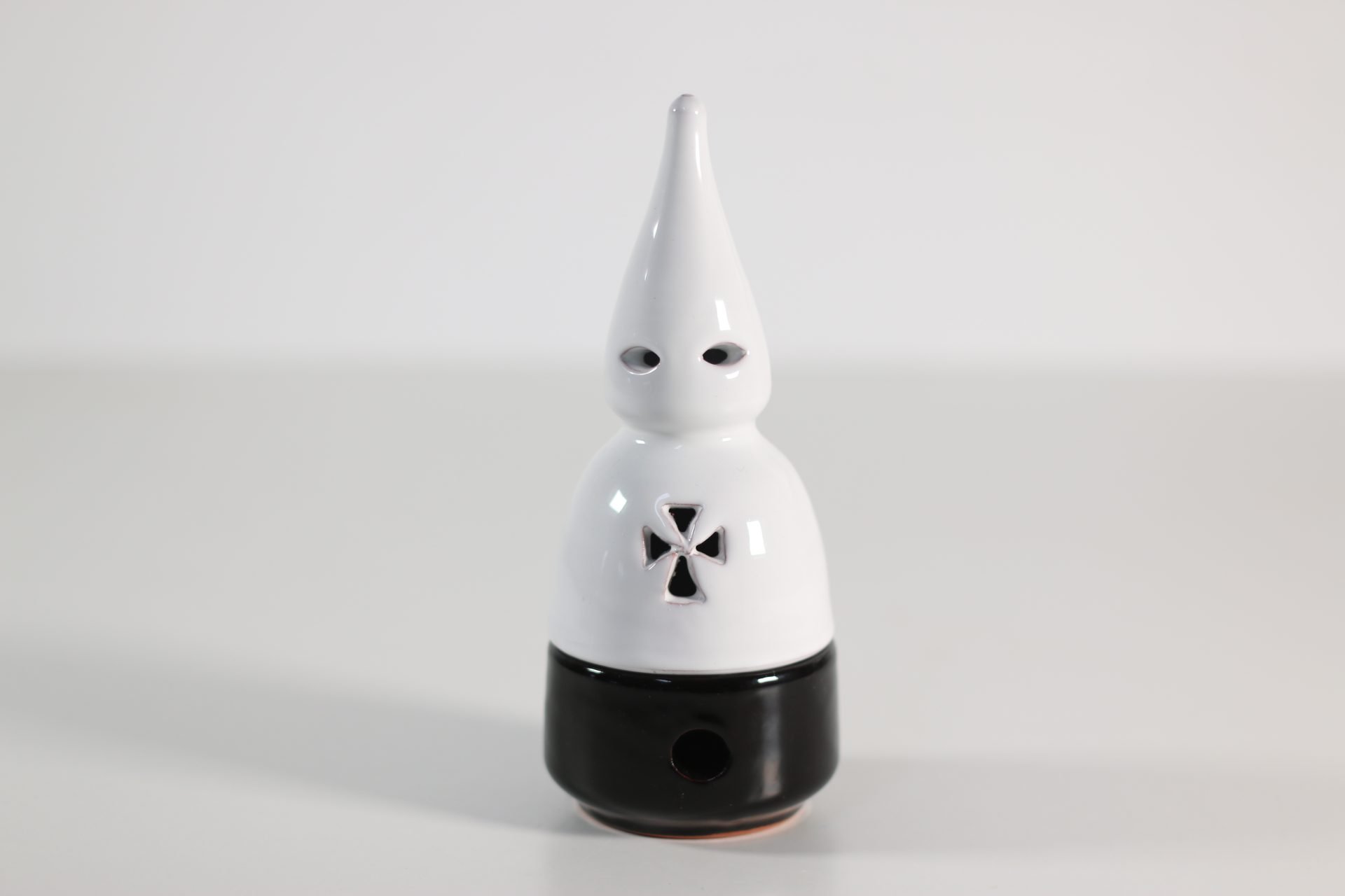 Incensario en forma de Nazareno elaborado en barro, pintado y esmaltado. La pieza del capirote está cromada de color blanco y la de la base de color negro.